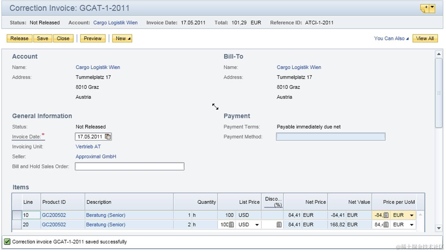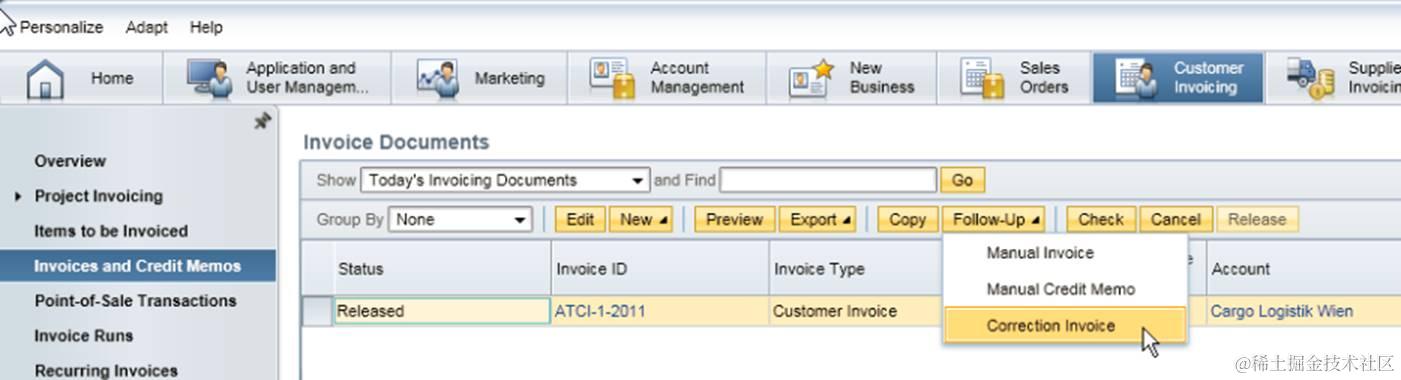 Another prerequisite is the seller party in the correction invoice should be in country DE, CH or AT. Seller party is decided by the logic behind of the New Correction Invoice UI after you enter Employee Responsible which is defaulted as current logon user. It seems that you cannot enter an employee in another company. That means you cannot change seller party when you create correction invoice for customer invoices. The option would be to log on with a proper user who is assigned to the seller party in country DE, CH or AT and the user has access right to the work center view. Existing user CEO01AT can be used for this purpose. (How to find the user? Search users in Application And User Management work center by assigned work center view ) Unfortunately the user password is not INIT69 and changing existing template users password is not a good idea. So to create a PUMA user which is copied from the user could be an option. After the normal customer invoice is created with the user and released, the function Correction Invoice is available for this customer invoice.