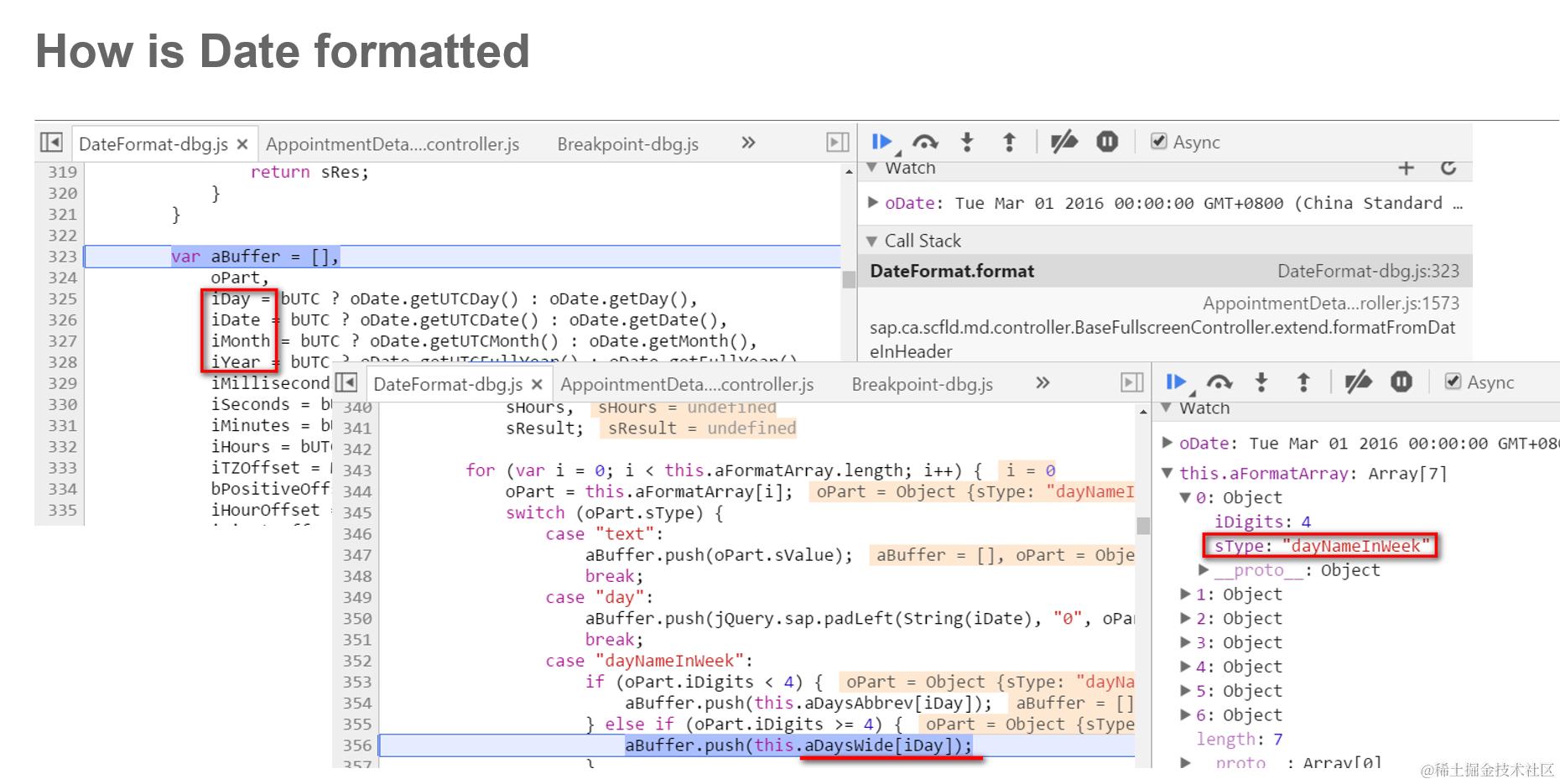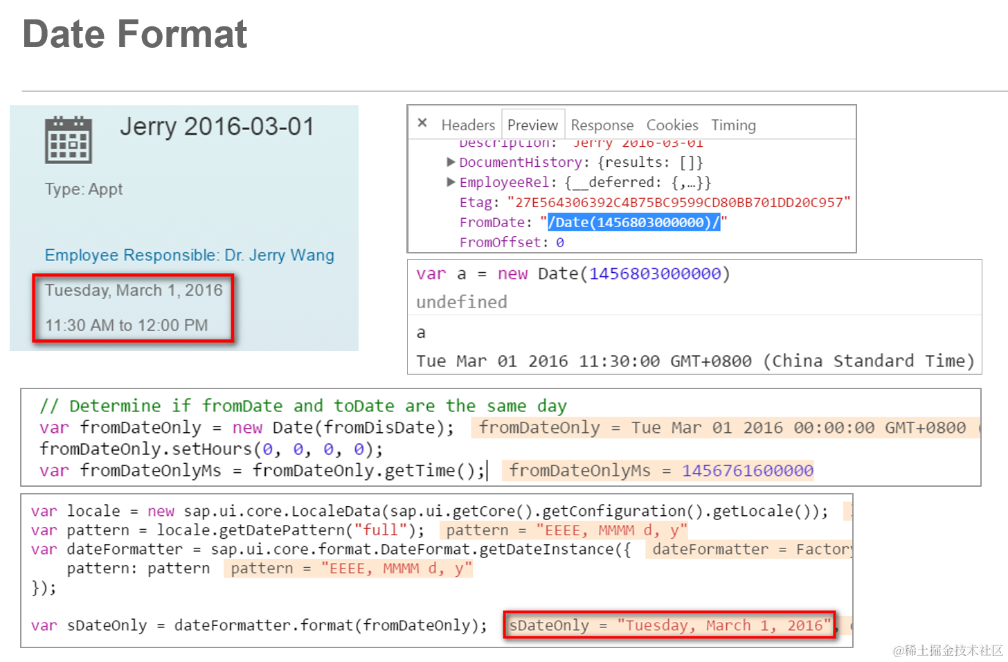 SAP Fiori应用里日期格式的显示奥秘 已注销 2021-04-26 89 阅读1分钟 下图这个Fiori应用里的日期显示,Tuesday, March 1,2016,从后台返回的值为/Date(1456803000000)/ 那么前台显示的可读性较好的日期是如何转成而成的? 奥秘就在Jerry这些单步调试的代码截图里: 要获取更多Jerry的原创文章,请关注公众号"汪子熙":