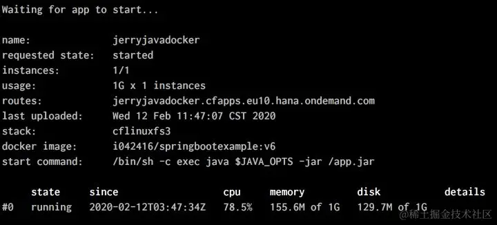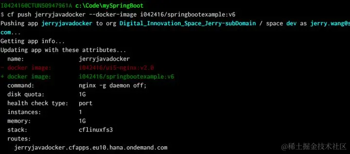 (3) 登录SAP云平台CloudFoundry环境,使用命令行部署, 用参数–docker-image指定我们刚刚上传到Docker Hub上的镜像名称,部署生成的应用名叫jerryjavadocker.