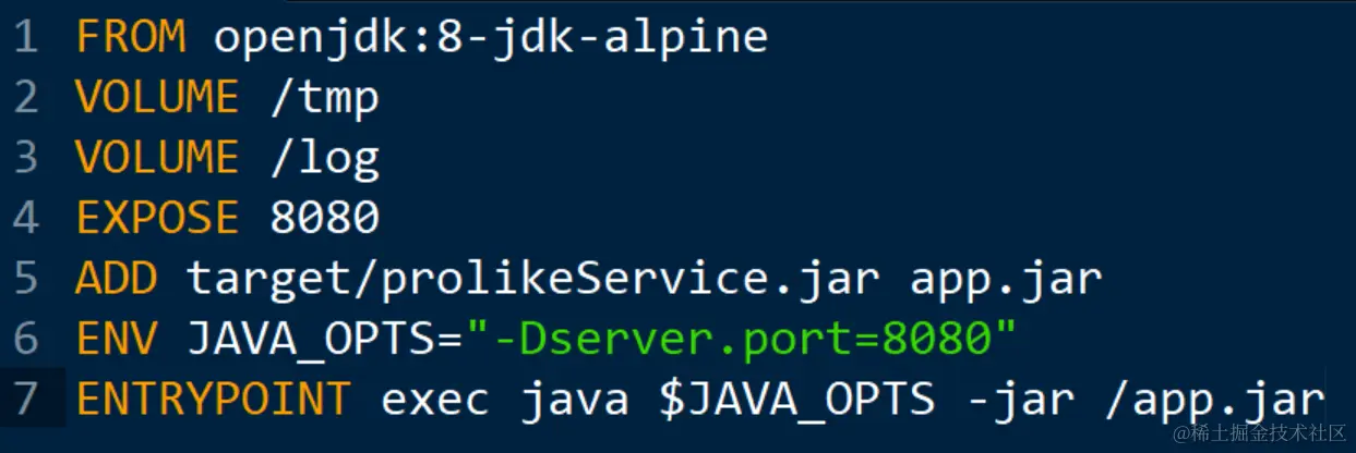 第六~七行:设置JVM启动参数,暴露8080端口给外部。