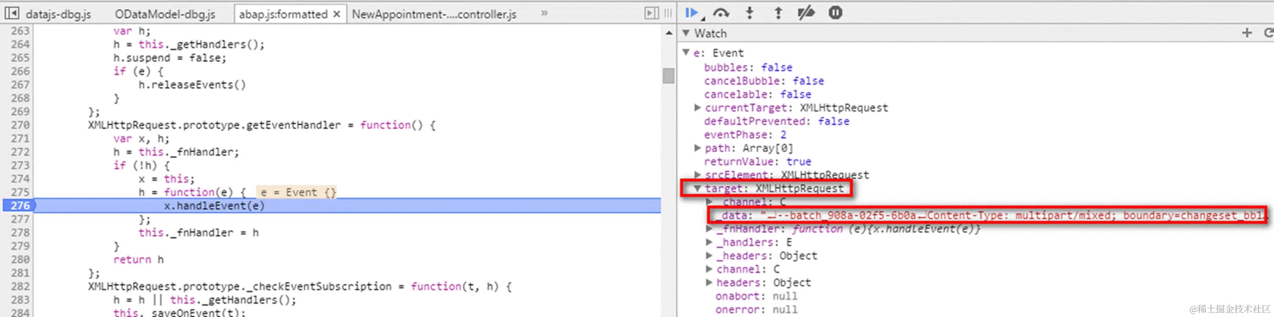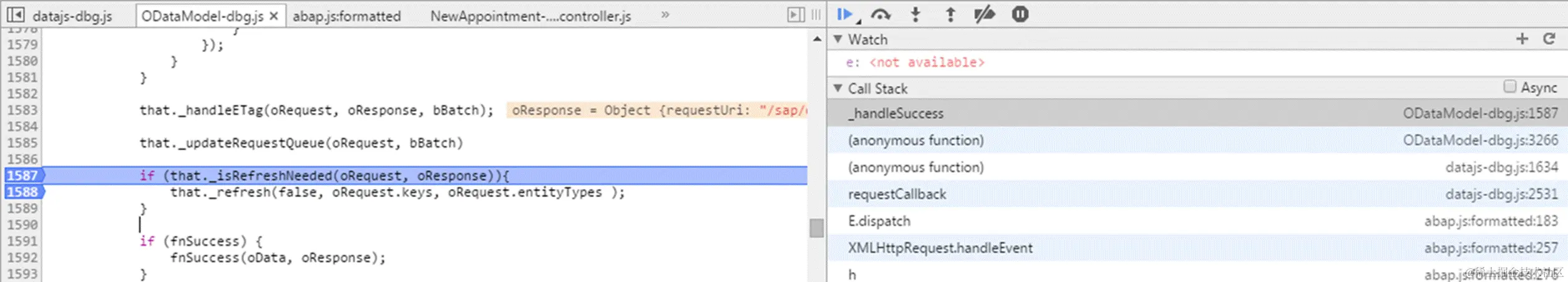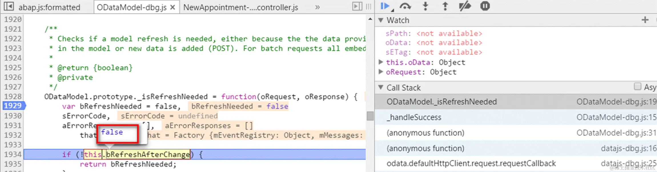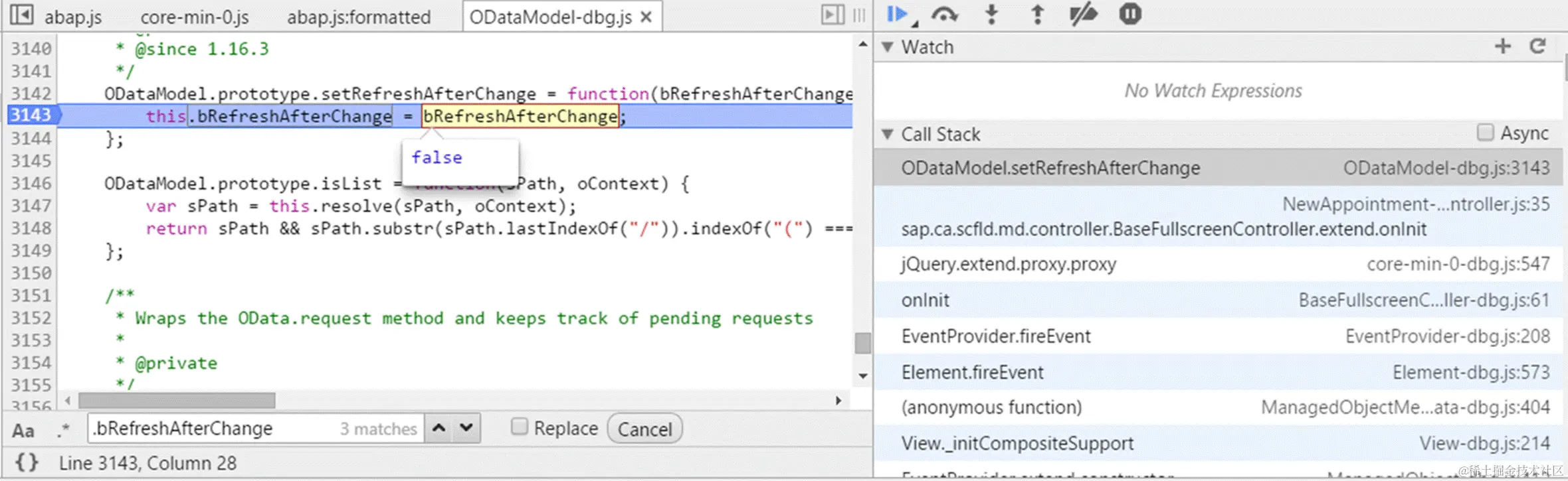 So why is this difference between two systems? In Chrome development tool, search the boolean variable name and we found one function setRefreshAfterChange defined for ODataModel. Just set a breakpoint in this method and re-launch the application in my internal system from beginning: