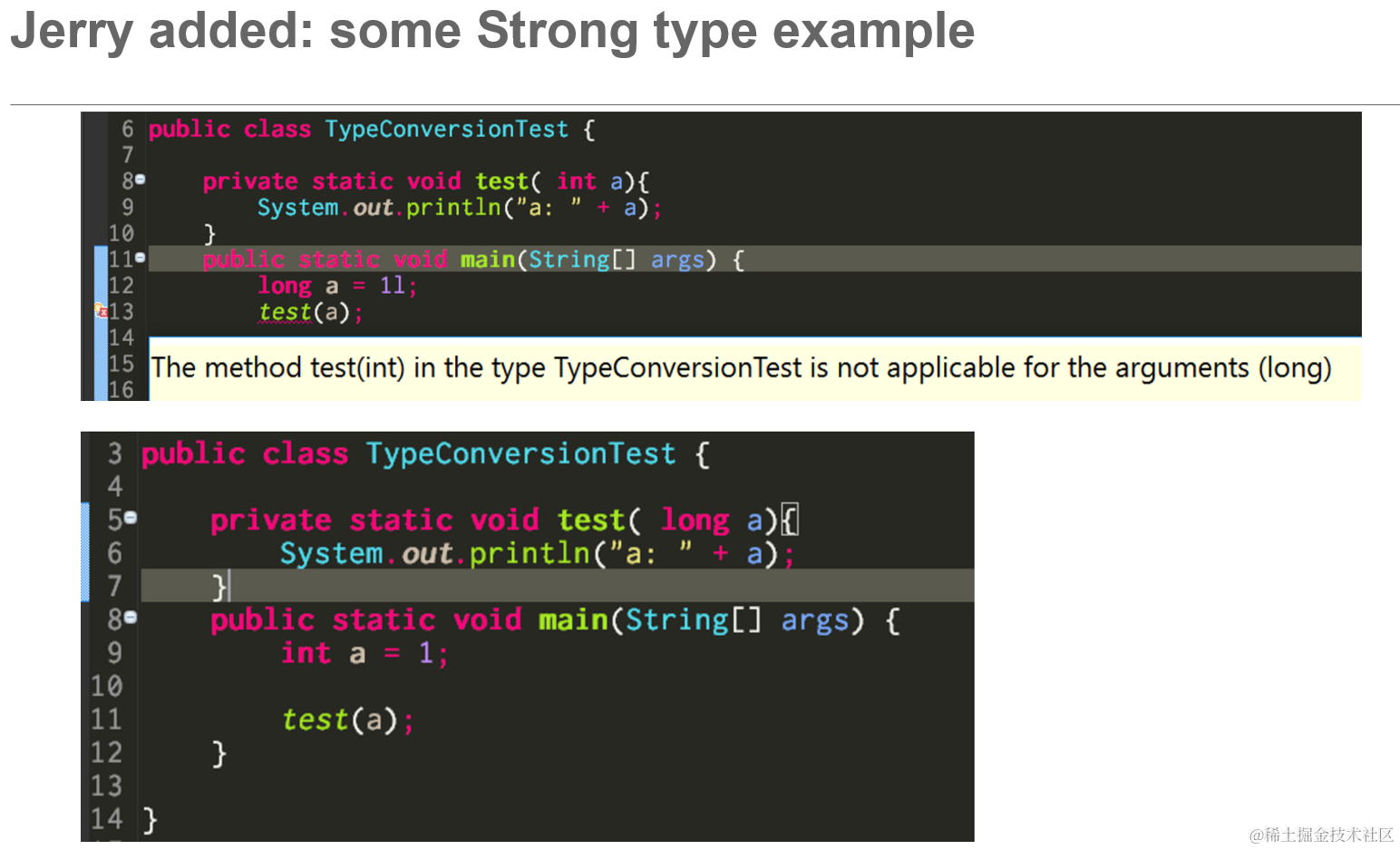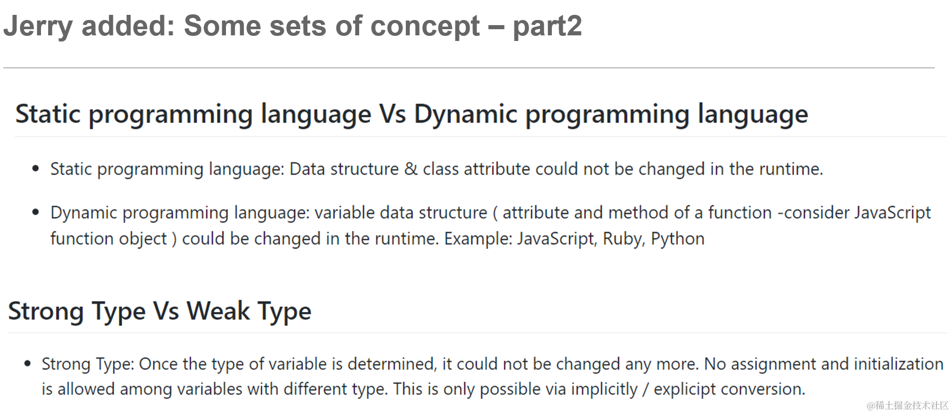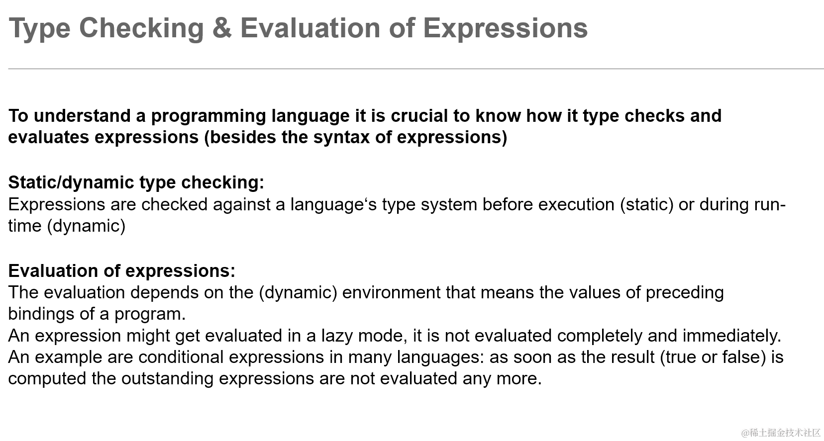 编程语言里函数方法类型检查的重要性 已注销 2021-04-26 43 阅读1分钟 importance of type checking and evaluation 静态类型检查和动态类型检查: 静态语言 vs 动态语言 强类型语言 vs 弱类型语言 显式类型转换 vs 隐式类型转换 弱类型的例子: 要获取更多Jerry的原创文章,请关注公众号"汪子熙":