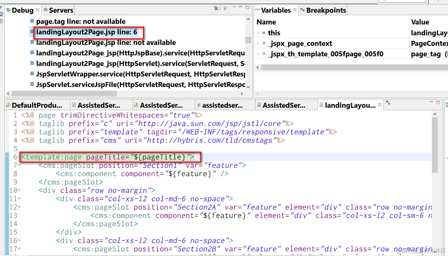 在我们通过前面issue介绍的办法找到Hybris home page的实现之后,如果通过debug的方式启动server,打开首页时断点会在line 6停下来。
