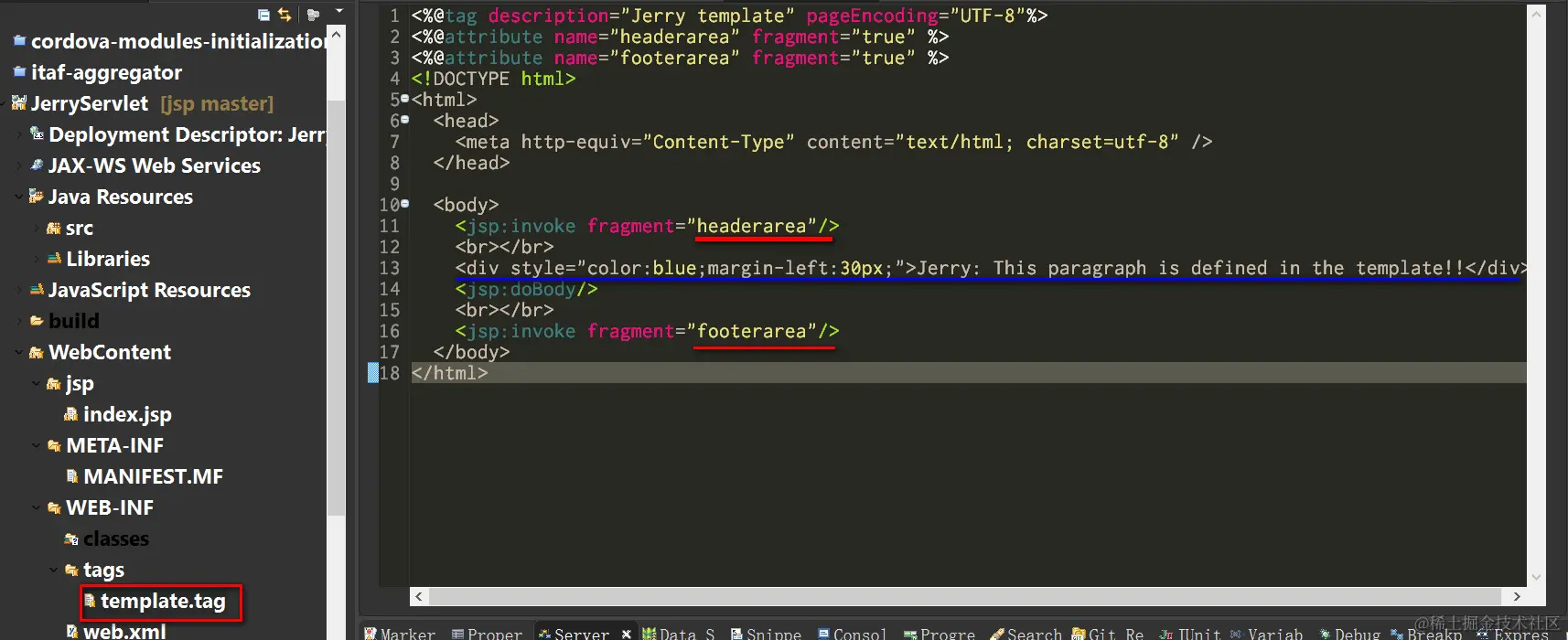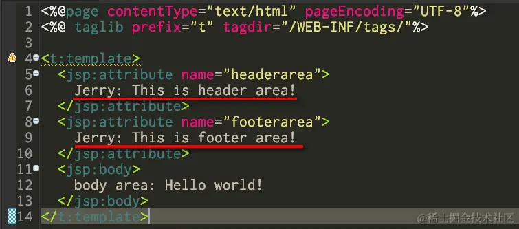 我创建了一个template.tag, 里面定义了一个skeleton, 其中蓝色的div是我hard code进去的,而两个fragment headerarea和footerarea相当于Fiori里的extension hook,允许这个template的consumer填值进去。