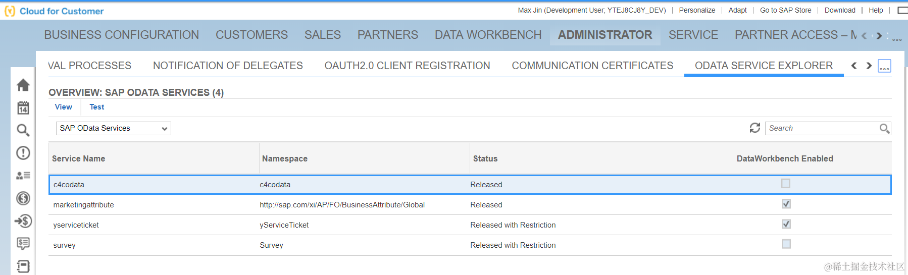 SAP Cloud for Customer和SAP Fiori系统里的OData测试工具 已注销 2021-04-26 106 阅读1分钟 C4C C4C里自带了一个类似postman的Odata service测试工具。 Work center Administrator->OData service explorer: 随便选一个OData service,点Test: 弹出一个新的窗口,就可以用OData console了: CRM Fiori 要获取更多Jerry的原创文章,请关注公众号"汪子熙":