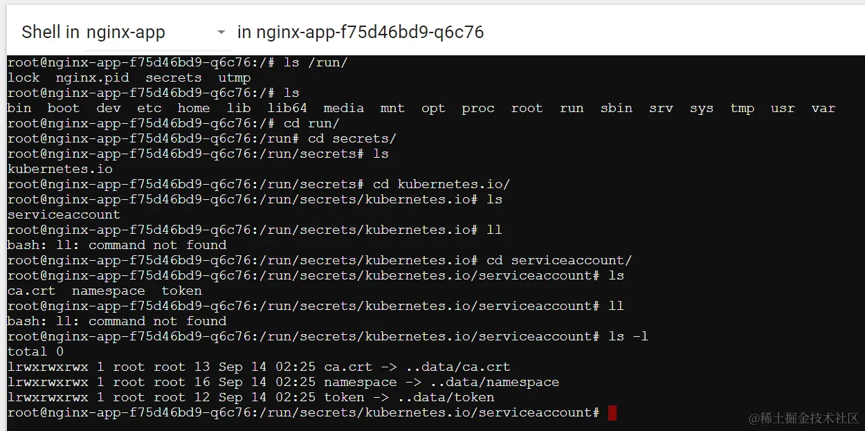 Pod的 /run/secrets/kubernetes.io/serviceaccount 目录中。