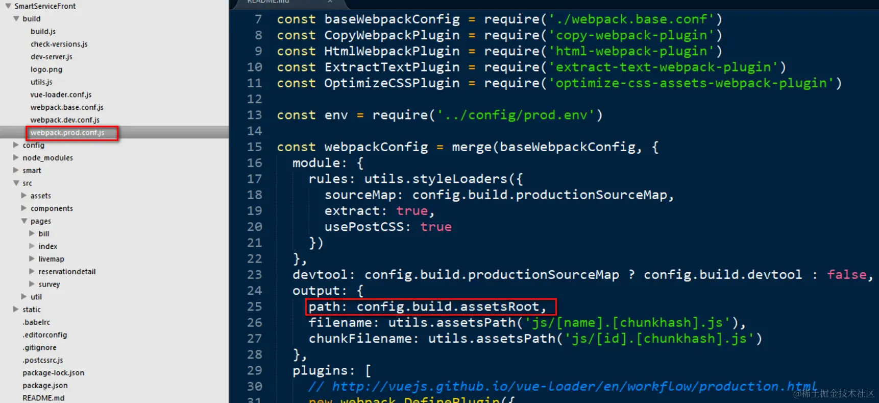 然后生产环境输出路径直接饮用前一张图定义的变量assetsRoot, 见下图第25行: