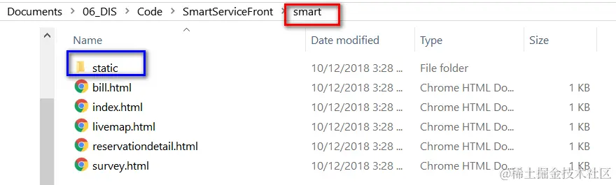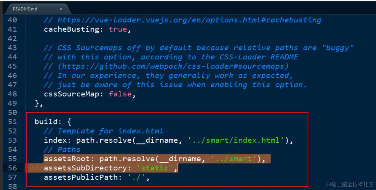 例子:我指定了生产环境下web pack输出的Root文件夹为smart ( 第55行),子文件夹为static(56行):