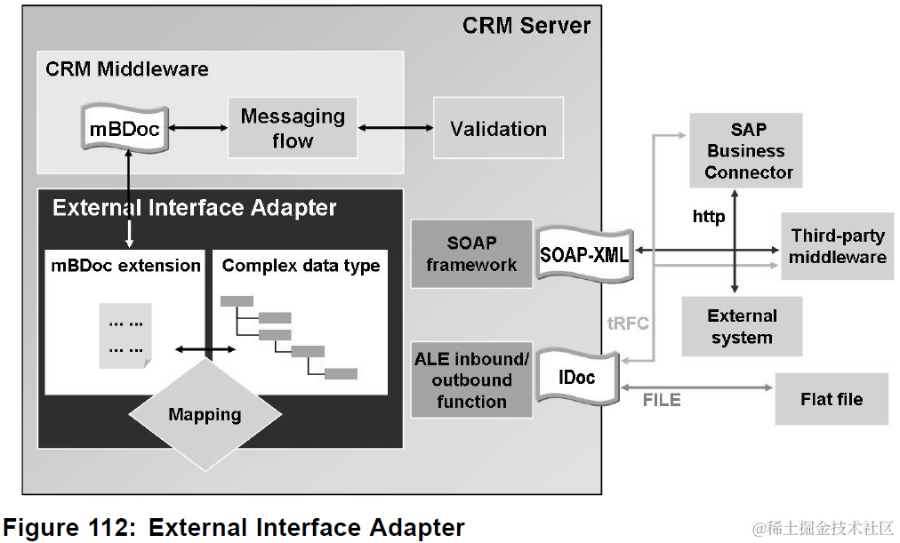 (4) XIF Adapter converts mBDoc to XML-like or IDOC and an appropriate basic service (SOAP, ALE) is started that sends the data object to the external receiver, for example, via a third-party Middleware tool.