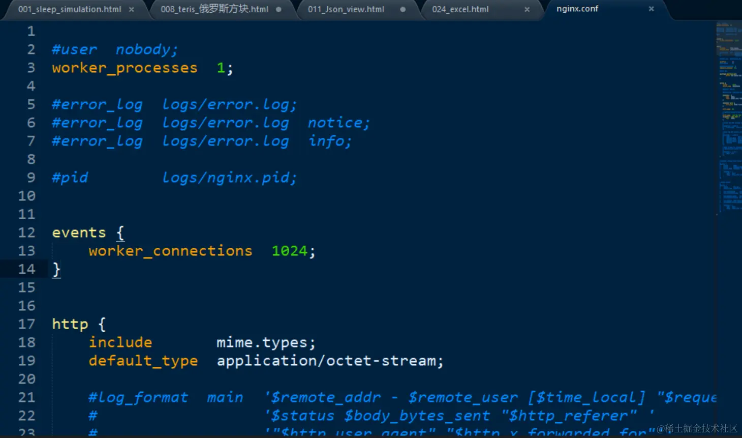 重启sublime text,这是语法高亮效果下的nginx.conf, 这时候编辑它要容易多了: