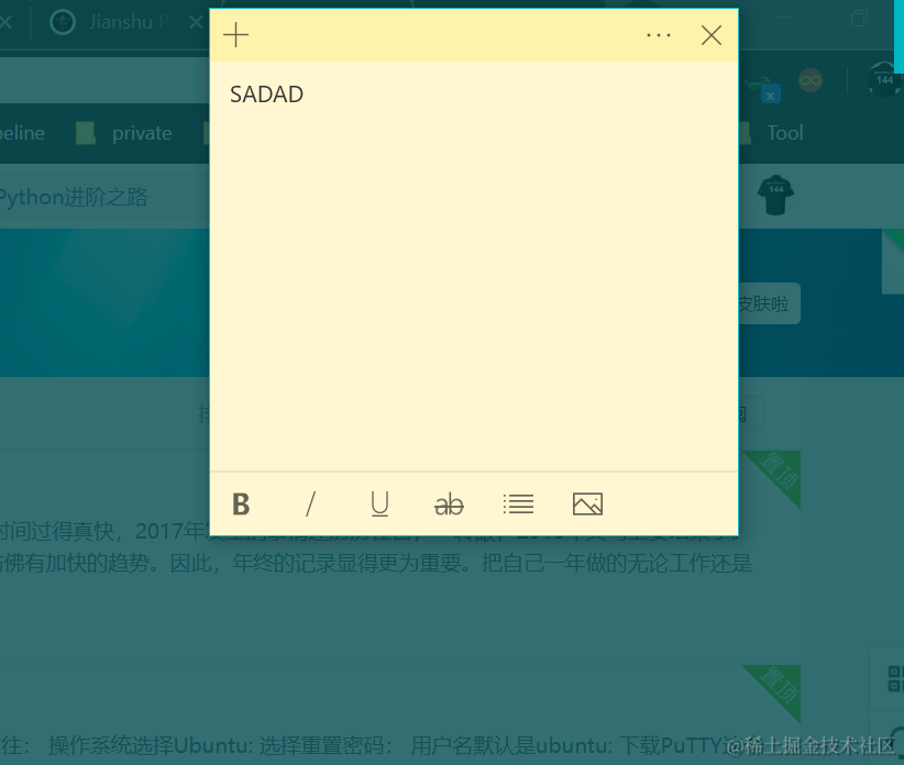 还在找各种便签软件?Windows10自带的便签足矣 已注销 2021-04-26 379 阅读1分钟 快捷键win + w,在召唤出的窗口里选择Sticky Notes: 新建一个便签: 可以看到这个自带的便签软件的编辑功能是很全的,字体加粗,斜体字,下划线,待办事宜等一应俱全: 还可以替换背景色: 查看便签列表: 要获取更多Jerry的原创文章,请关注公众号"汪子熙":