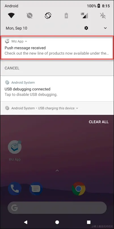 如果我们测试的应用当前处于后台运行状态,则来自SAP Cloud Platform的Notification推送到达移动设备后,表现形式如下: