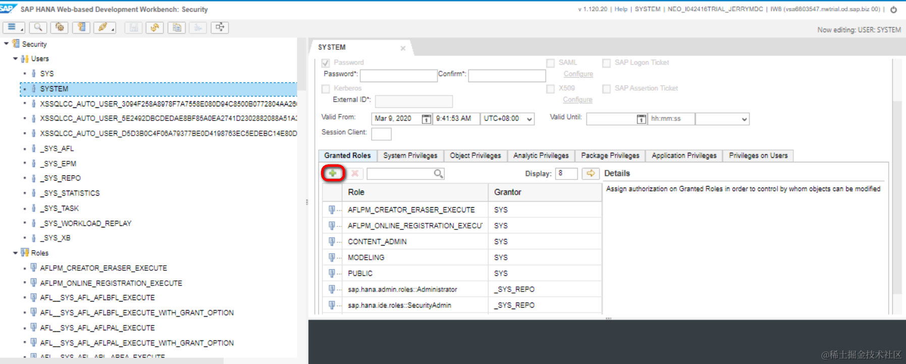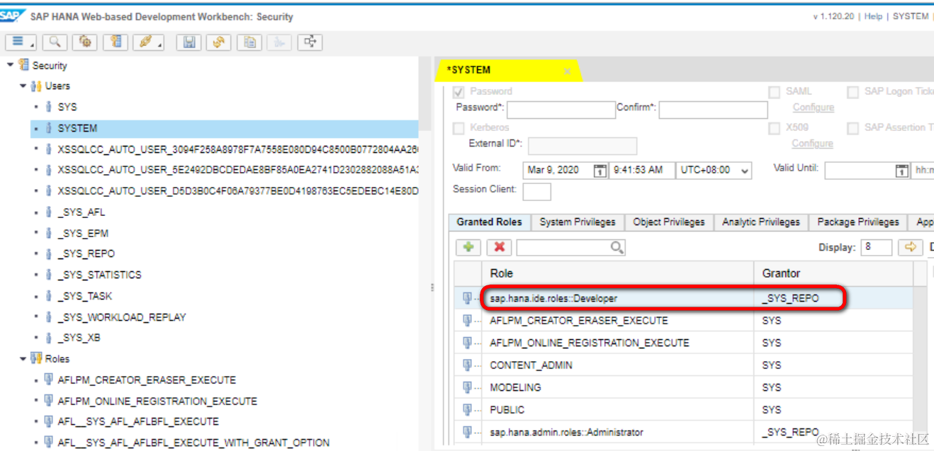将sap.hana.ide.role::Developer role添加给SYSTEM用户:
