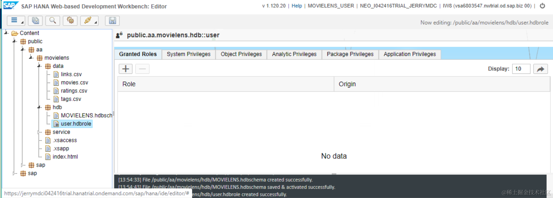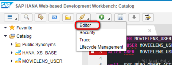 call _SYS_REPO.GRANT_ACTIVATED_ROLE ('sap.hana.xs.ide.roles::EditorDeveloper' ,'MOVIELENS_USER');