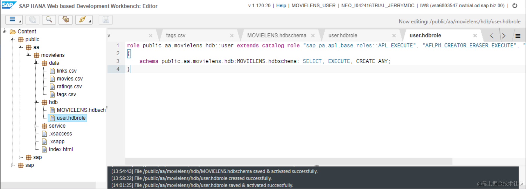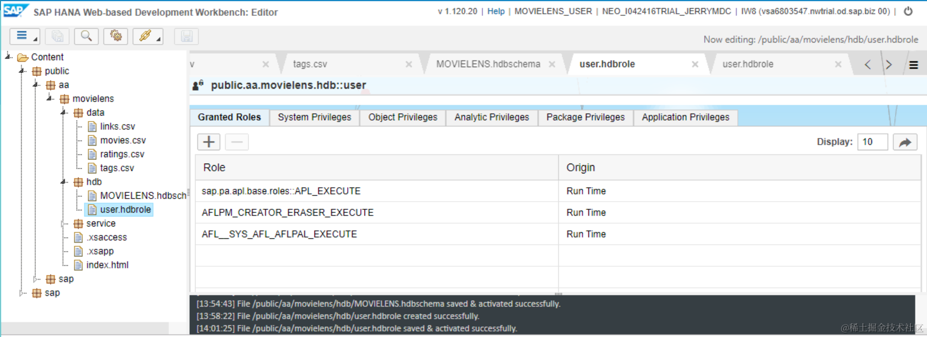 call _SYS_REPO.GRANT_ACTIVATED_ROLE ('sap.hana.xs.ide.roles::Developer' ,'MOVIELENS_USER');