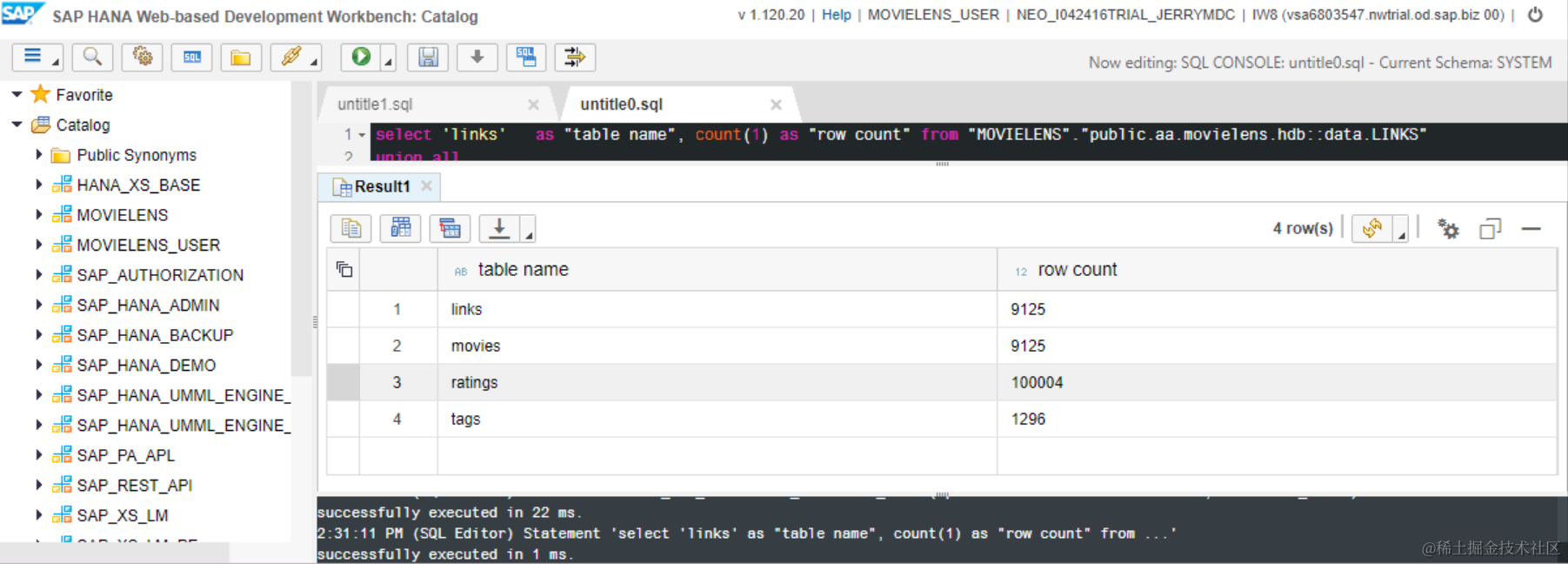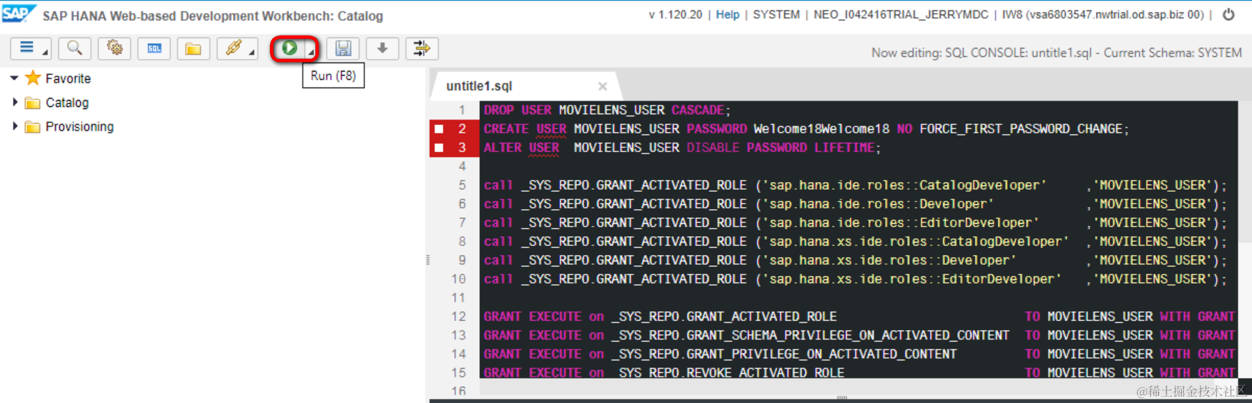 call _SYS_REPO.GRANT_ACTIVATED_ROLE ('sap.hana.ide.roles::EditorDeveloper' ,'MOVIELENS_USER');
