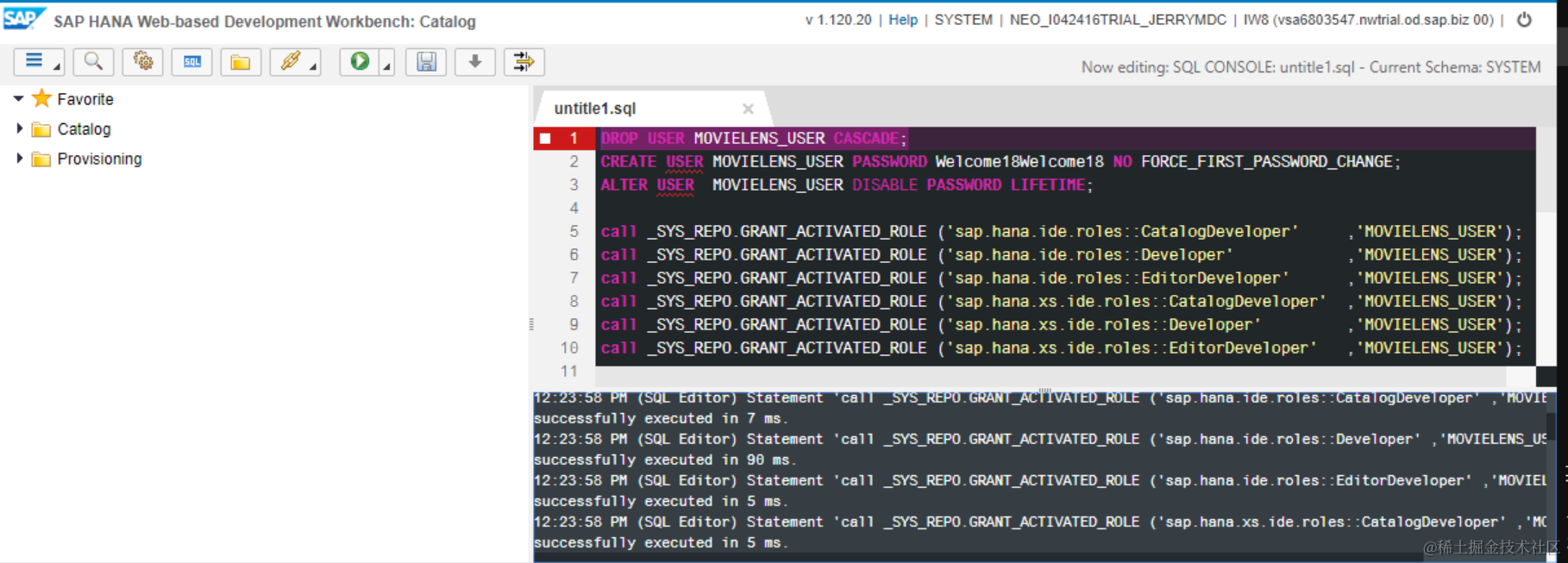 call _SYS_REPO.GRANT_ACTIVATED_ROLE ('sap.hana.xs.ide.roles::CatalogDeveloper' ,'MOVIELENS_USER');