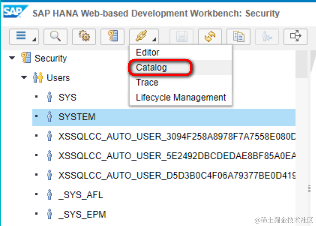首先在SAP Cloud Platform Neo环境的HANA MDC实例里,打开HANA Web-based development workbench,切换到Catalog视图: