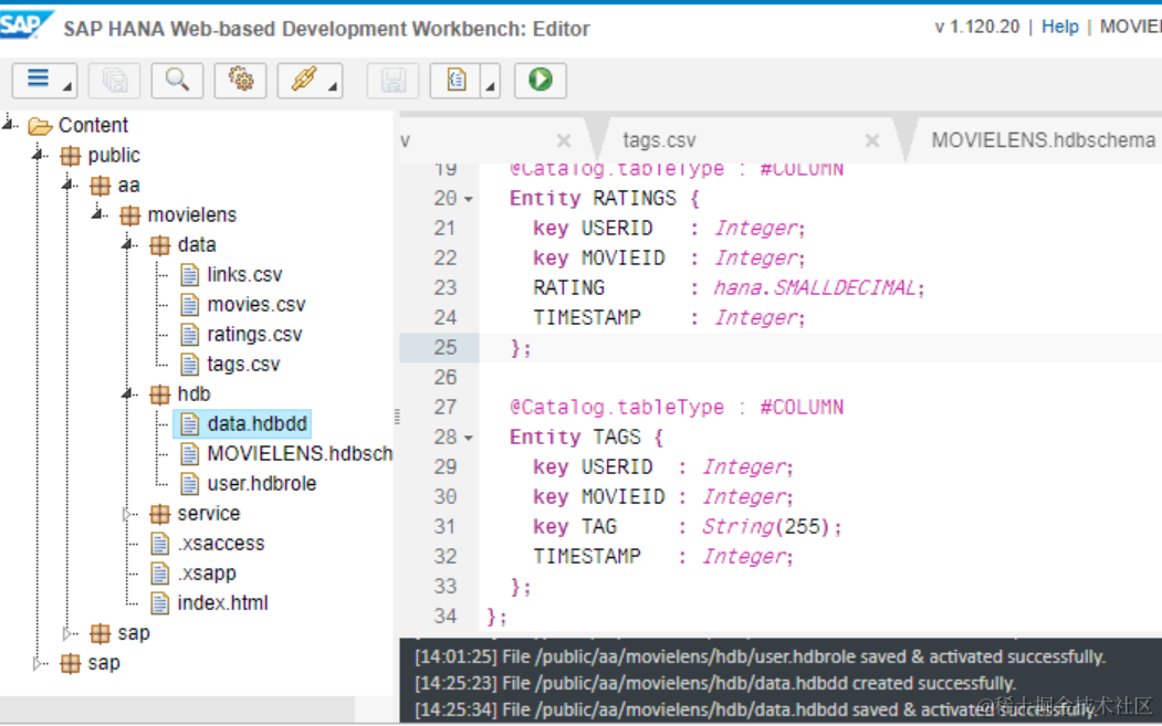 call _SYS_REPO.GRANT_ACTIVATED_ROLE (‘public.aa.movielens.hdb::user’,‘MOVIELENS_USER’);