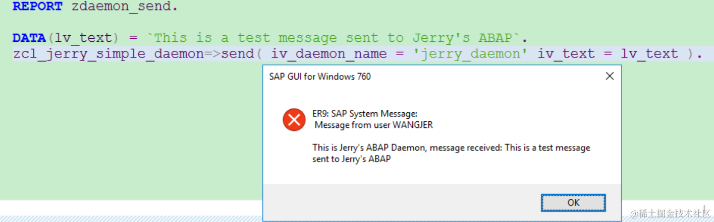 打开SAPGUI,使用如下的方法向jerry_daemon这个ABAP守护进程发送一条消息,会立即在SAPGUI里看到守护进程的on_message方法里弹出的对话框:
