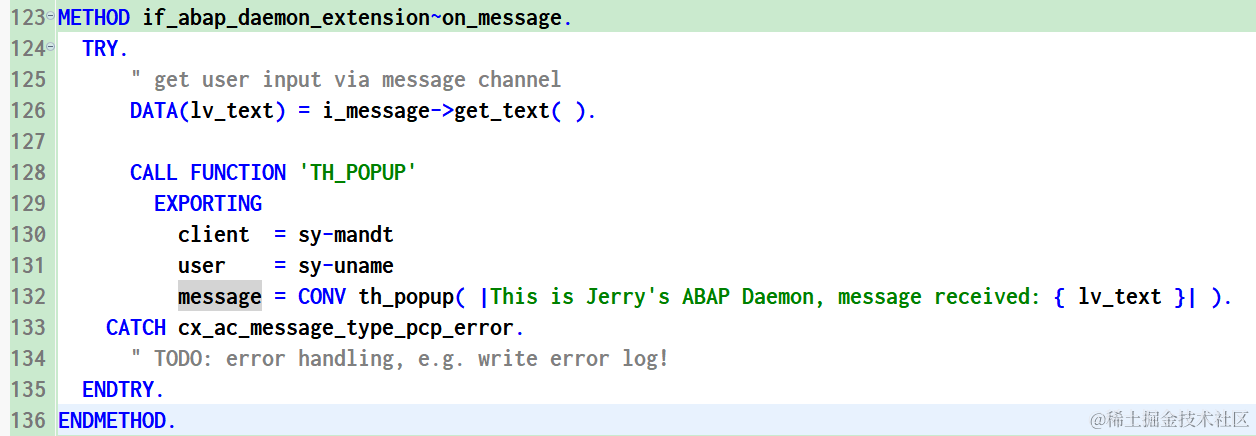 守护进程的启动则通过框架类cl_abap_daemon_client_manager的start方法实现,第75行start方法传入的参数lo_pcp作为守护进程启动参数一并传入,pcp代表Push Channel Protocol,一种用于消息传递的数据结构。