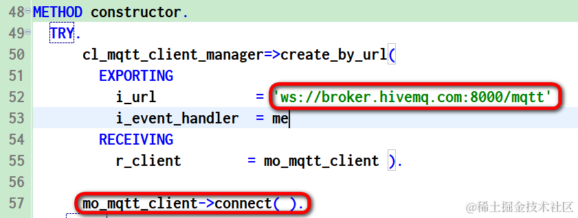 在ABAP类的构造函数里连接MQTT broker,把返回的MQTT客户端实例存储在类的成员变量mo_mqtt_client里,接下来就能使用该实例的publish方法去发送消息,subscribe方法订阅消息,on_message方法接收消息。