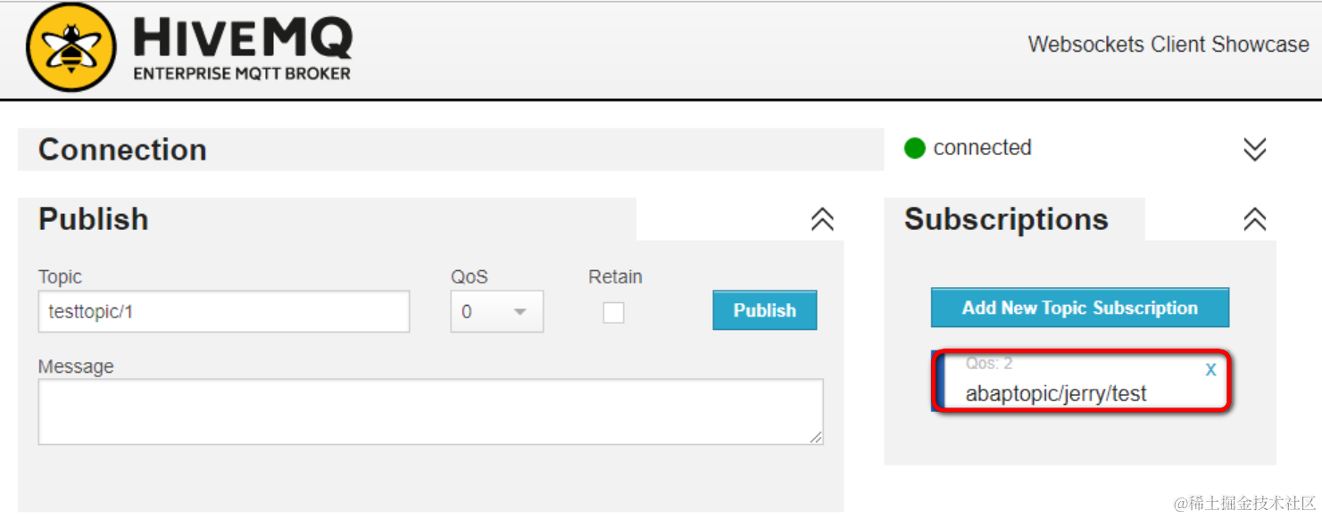 打开MQTT客户端,订阅渠道:abaptopic/jerry/test