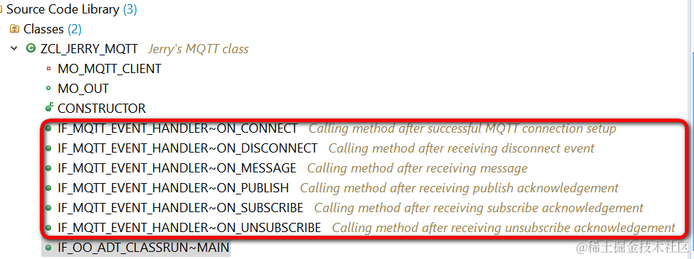 新建一个ABAP类,实现SAP标准接口IF_MQTT_EVENT_HANDLER的对应方法。