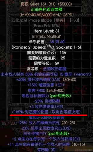 暗黑破坏神II里有很多对恶魔(Demon)造成额外伤害的武器,比如下面这把用符文之语悔恨(Grief)制成的幻化之刃,对恶魔生物造成额外185%伤害: