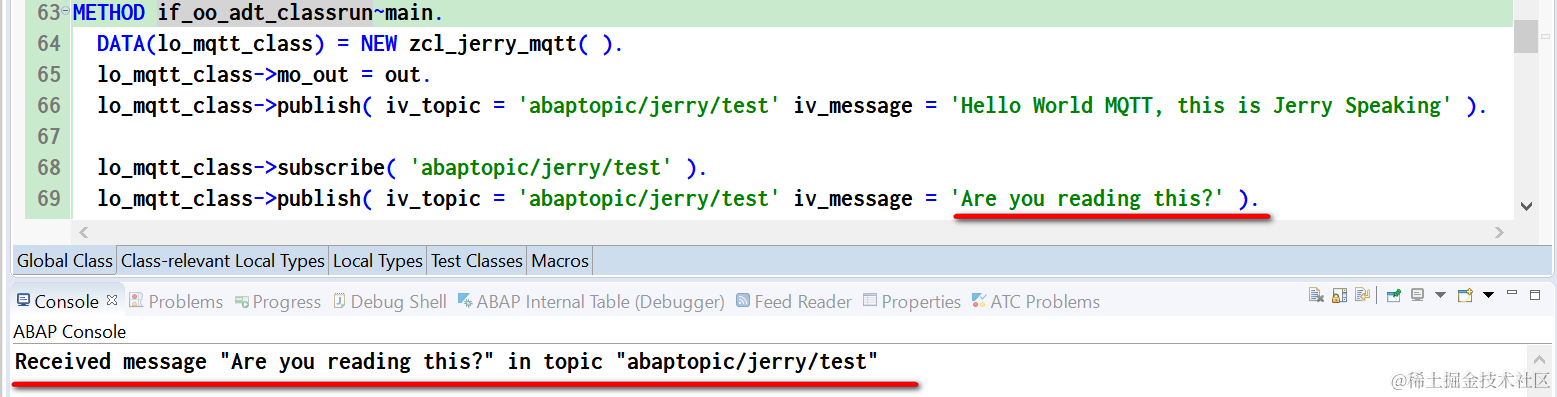 接着我首先在第66行,往该渠道发送一条Hello World的消息,broker收到后会将其原封不动地返回,但因为我的ABAP类并没有订阅这个渠道,因此不会收到这条hello world消息的回复。