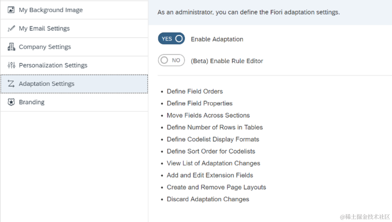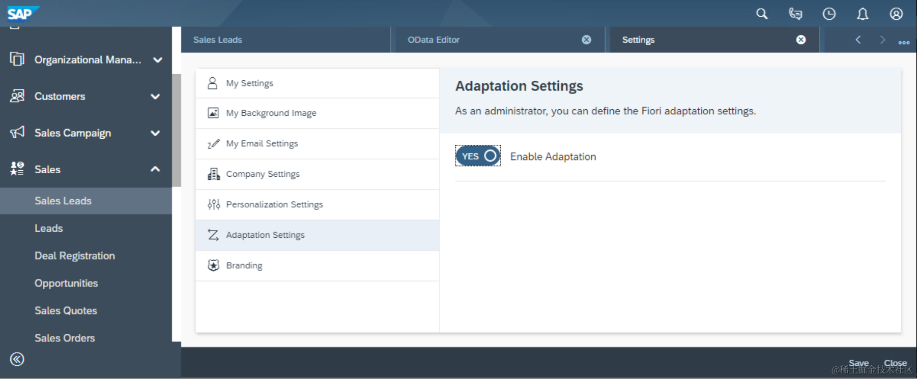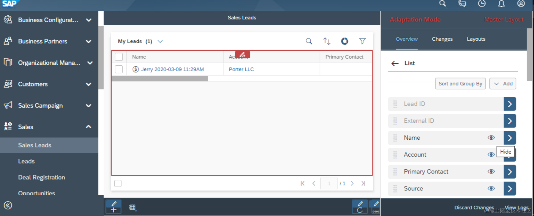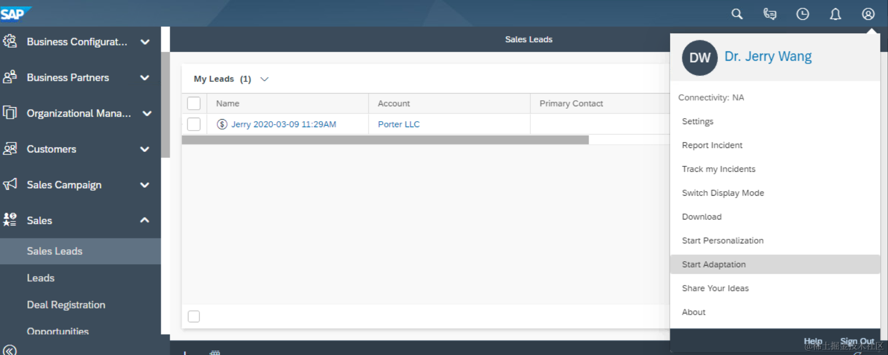SAP Cloud for Customer最新版本2002 RUI如何启用adaptation模式 已注销 2021-04-26 76 阅读1分钟 点击设置按钮: 打开Adaptation Settings,将Enable Adaptation开关打开: 之后就可以通过Start Adaptation进入配置模式了: 在此模式下,可以隐藏字段或将未显示的字段配置出来: 要获取更多Jerry的原创文章,请关注公众号"汪子熙":