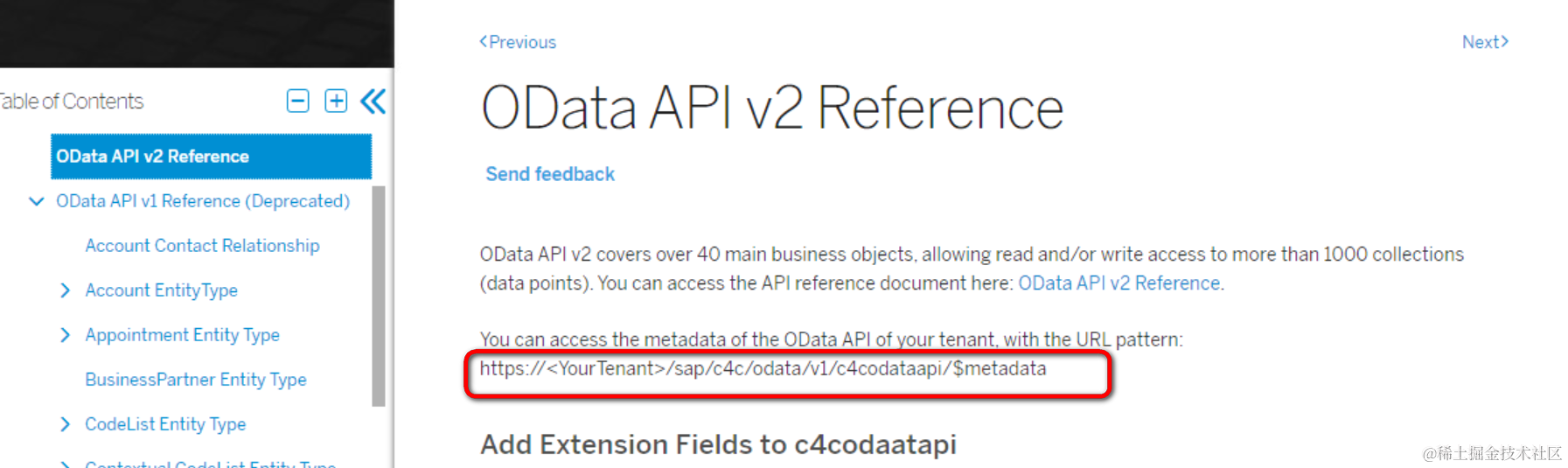 而按照SAP官网帮助文档,SAP Cloud for Customer OData API v2的url为https:///sap/c4c/odata/v1/c4codataapi/$metadata
