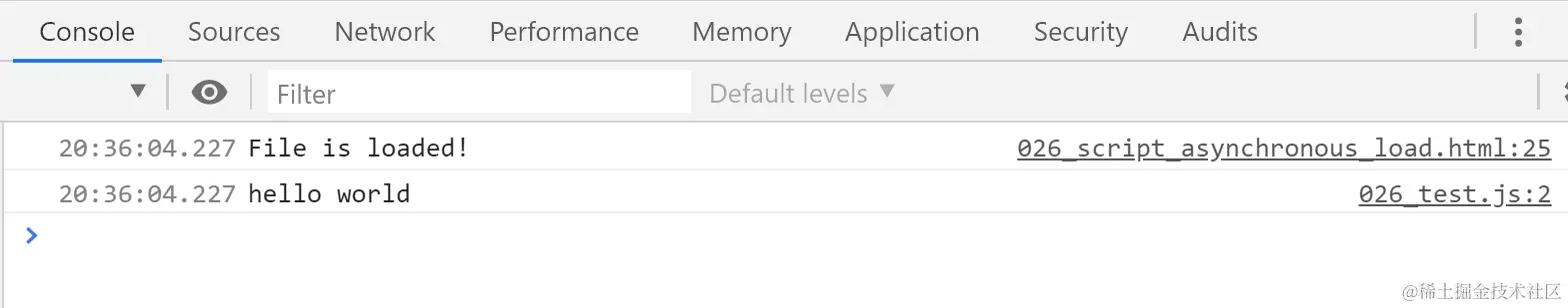 使用下列代码加载该脚本,加载成功后,回调函数打印出File is loaded的消息,同时被加载脚本test.js里的函数hello被调用,打印出hello world: