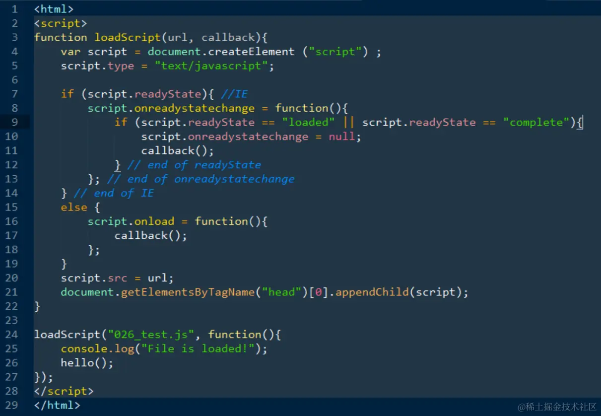 代码第四行里新建一个script标签页,在第8行的回调函数onreadystatechange里,根据属性readyState判断当前标签页的状态,如果为loaded或者complete,说明脚本加载成功,此时触发脚本加载人员指定的回调函数。