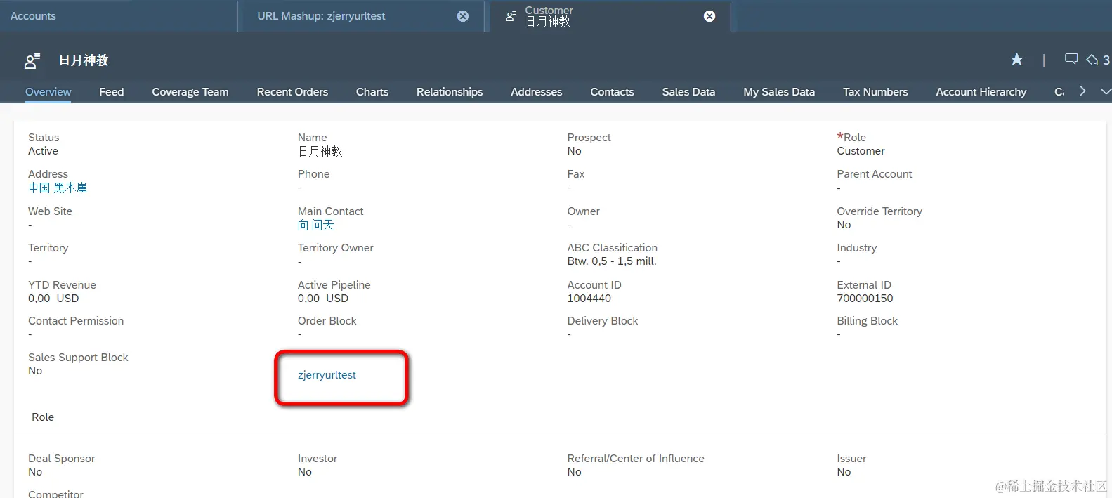 插入之后,在Account TI页面会看到一个外观为超链接的新字段,该字段就是url mashup的外在表现,点击之后,就弹出一个新的页面,打开了https://www.sap.com: