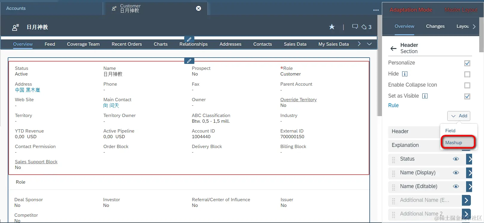 在Account TI页面的Overview标签页里,进入adaptation模式,点击Add->Add Mashup: