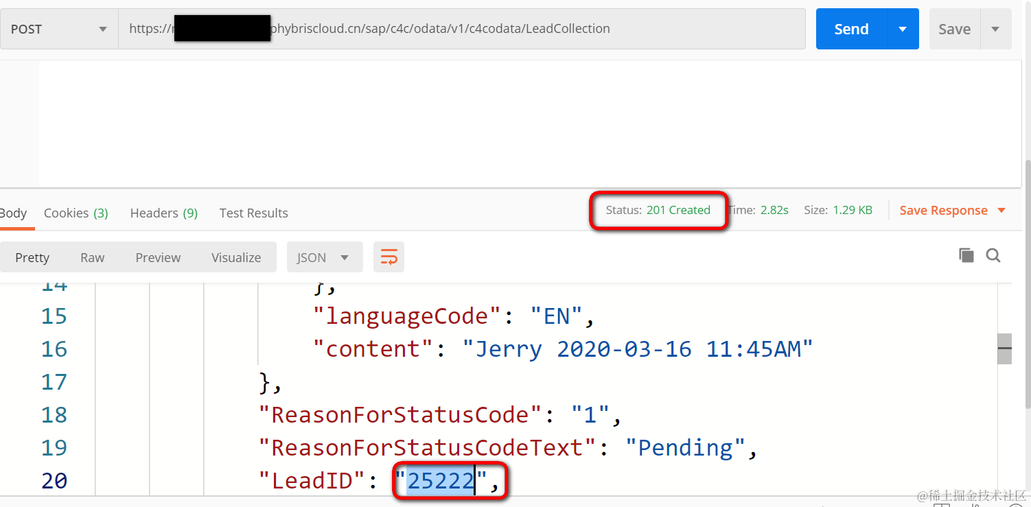 执行之后,HTTP状态码201代表创建成功,成功创建的LeadID包含在服务器返回的结果里: