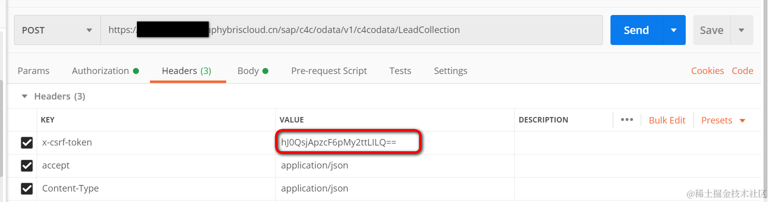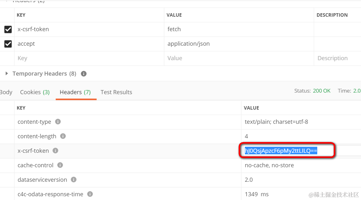 在Postman里执行该请求,在响应里拿到服务器颁发的csrf token:hJ0QsjApzcF6pMy2ttLILQ==