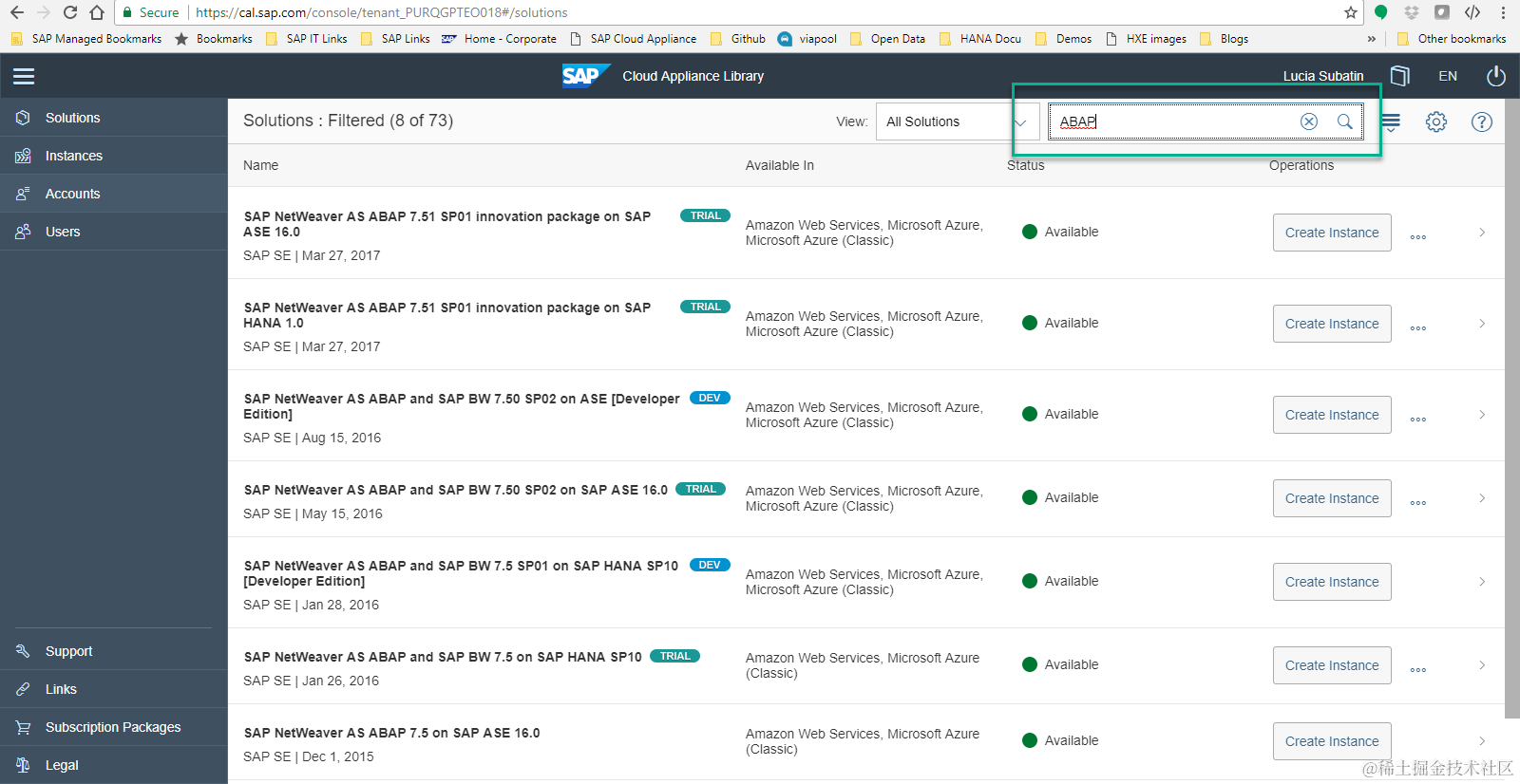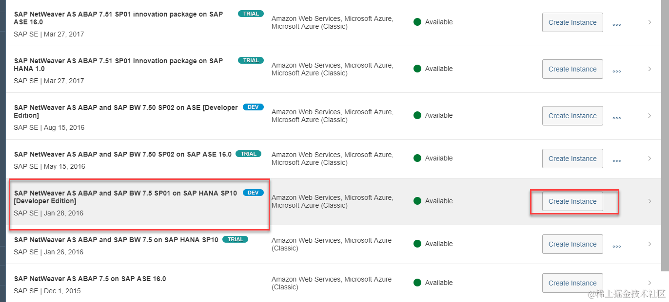 在结果里选择SAP NetWeaver AS ABAP and SAP BW 7.5 SP01 on SAP HANA SP10,点击Create instance:
