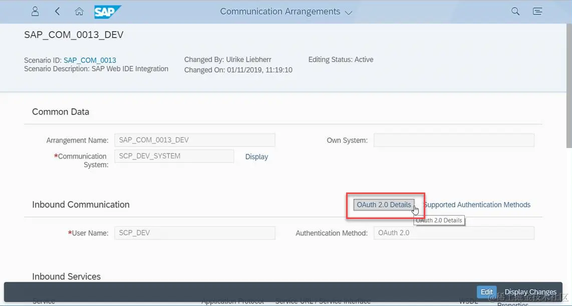 进入创建好的Communication Arrangement,在inbound Communication区域点击OAuth 2.0 Details: