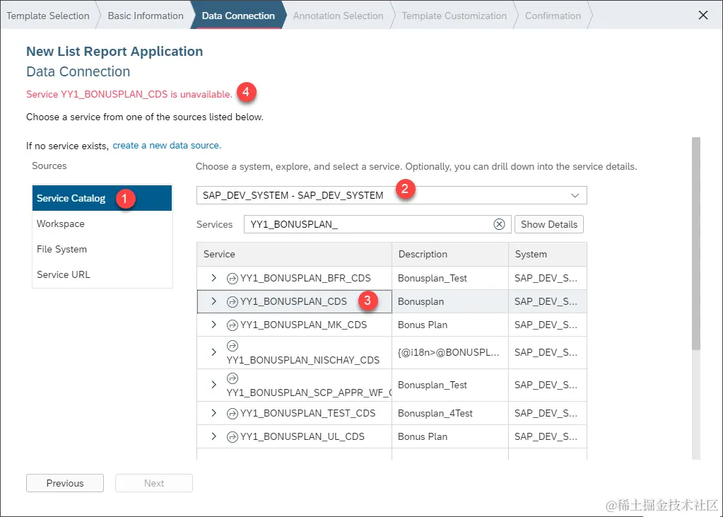 之后在SAP云平台的WebIDE里使用SAP UI5应用创建向导,在Data Connection这一步骤,就能从下拉菜单里看到这个Destination了。然而Destination指向的S/4HANA系统里的OData服务YY1_BONUSPLAN_还没法使用,报错误消息Service XXX is unavailable. 需要后续在S/4HANA系统将其暴露给外部系统才能使用。但是,S/4HANA和SAP Cloud Platform通过Destination的连接已经配置完成了。