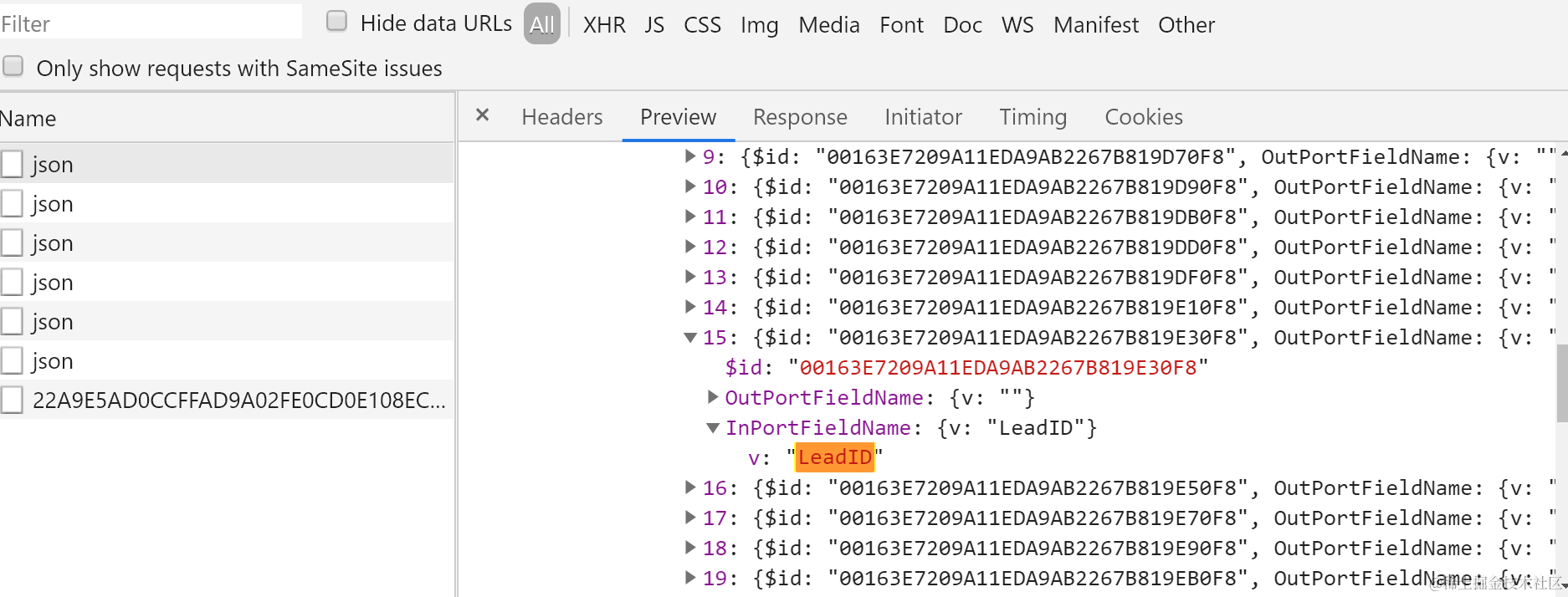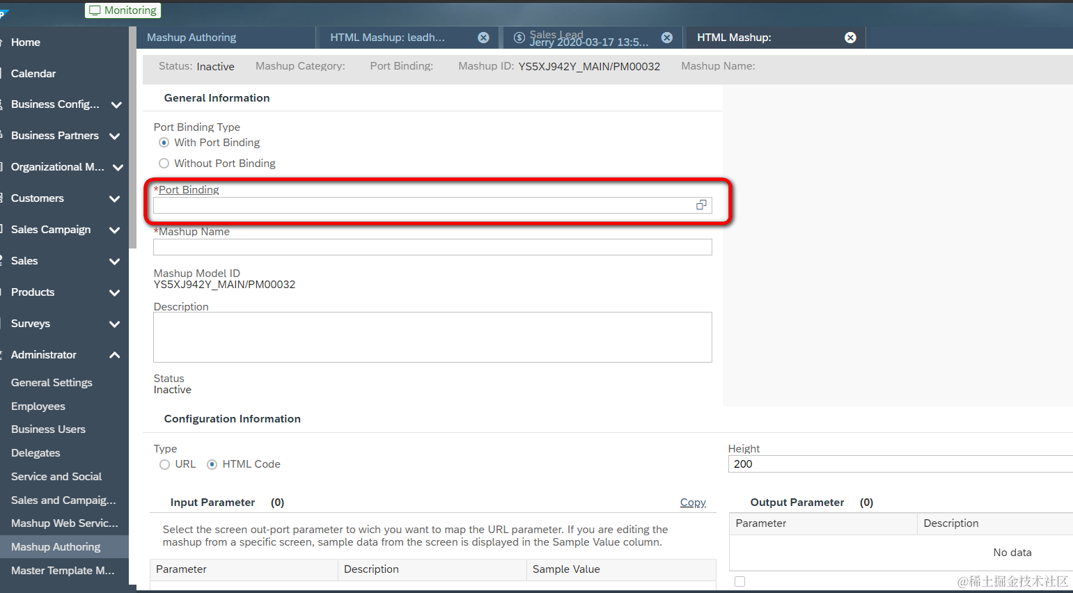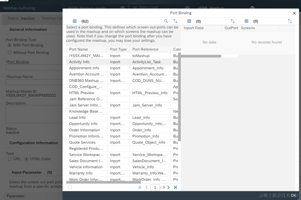 SAP C4C Mashup port bindingF4帮助对话框里的数据源 已注销 2021-04-26 68 阅读1分钟 我们在SAP Cloud for Customer上创建Mashup时,会选择port binding: 点了F4之后,看到的这些列表里的数据: 从Chrome开发者工具里能观察到这些数据是通过HTTP请求从后台返回的: 选中Lead_Info后:能看到Lead_Info这个inport提供的所有字段,这些字段又是另外一个HTTP调用取回的,其响应如下: 要获取更多Jerry的原创文章,请关注公众号"汪子熙":