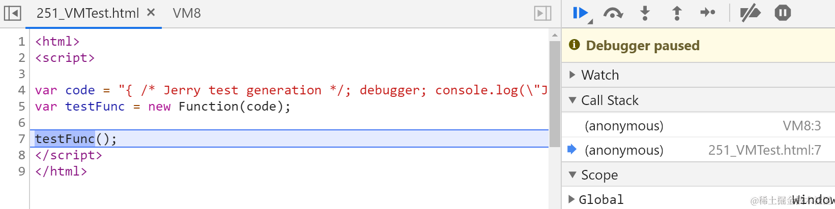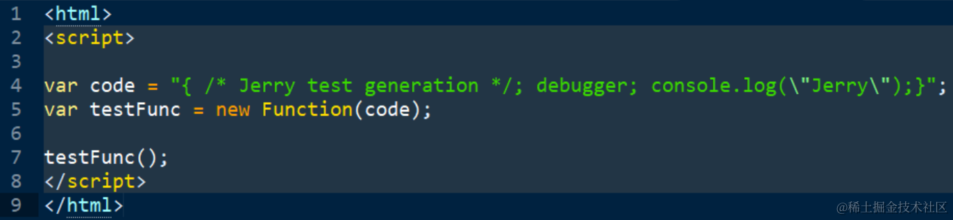 一串最简单的JavaScript代码,在Chrome开发者工具调试器里触发VM8标签的出现 已注销 2021-04-26 92 阅读1分钟 代码如下: <html> <script> var code = "{ /* Jerry test generation */; debugger; console.log(\"Jerry\");}"; var testFunc = new Function(code); testFunc(); </script> </html> 运行效果: 单步执行,进入testFunc函数: VM8标签就出现了: 要获取更多Jerry的原创文章,请关注公众号"汪子熙":