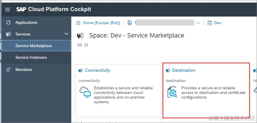 在SAP云平台CloudFoundry环境里创建一个Destination服务实例: