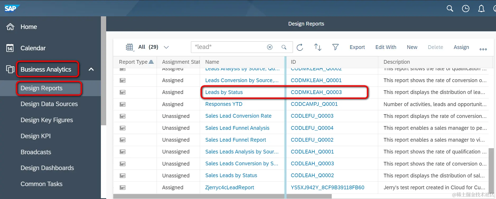 答案:来自SAP Cloud for Customer Business analytics的Design Reports里的report