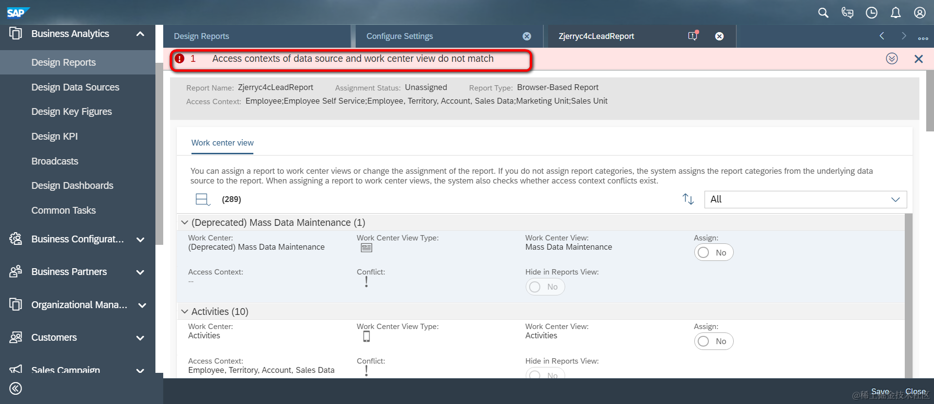 这个错误消息提示我们,data source的access context和待分配到工作中心的access context必须匹配: