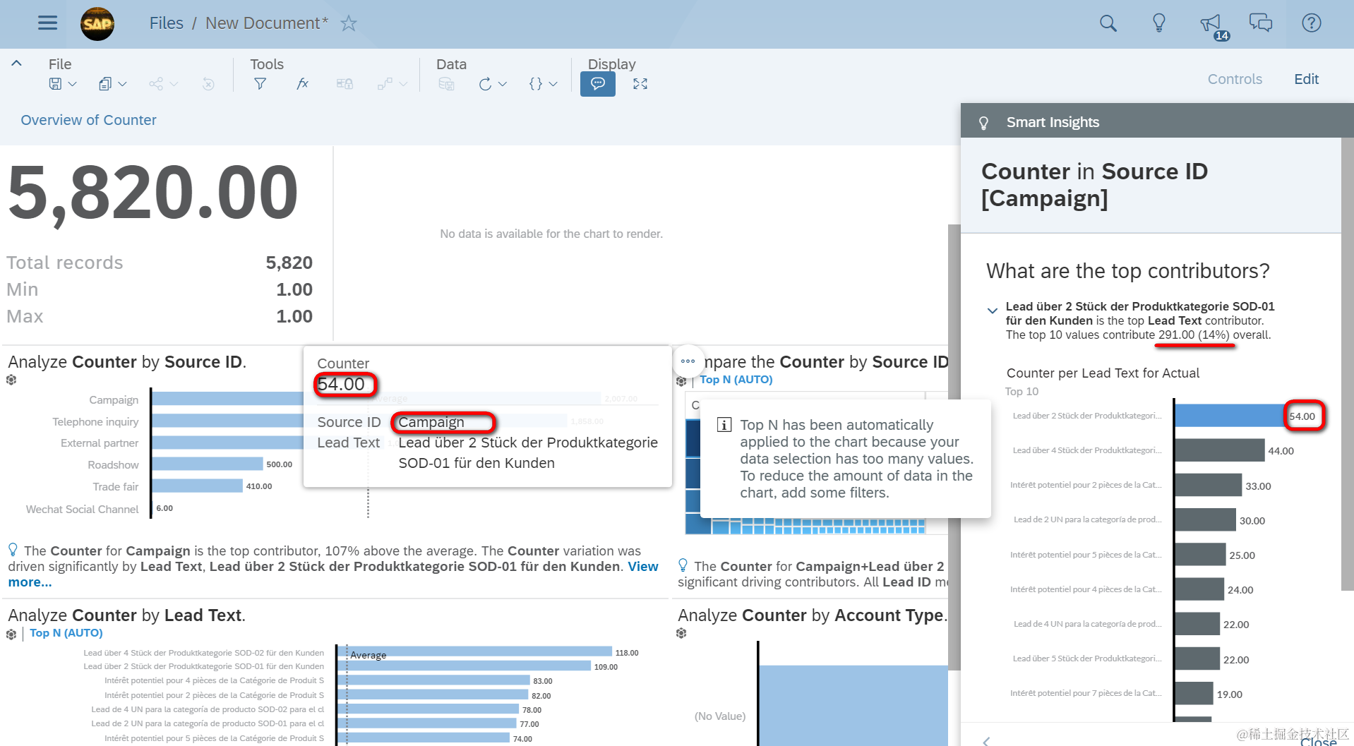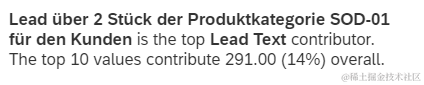 在Top 10里,排名第一的54个leads,其Lead Text描述信息都为“Lead über 2 Stüick der Produktkategorie SOD-01für den Kunden is the top Lead Text contributor.The top 10 values contribute 291.00 (14%) overall.”: