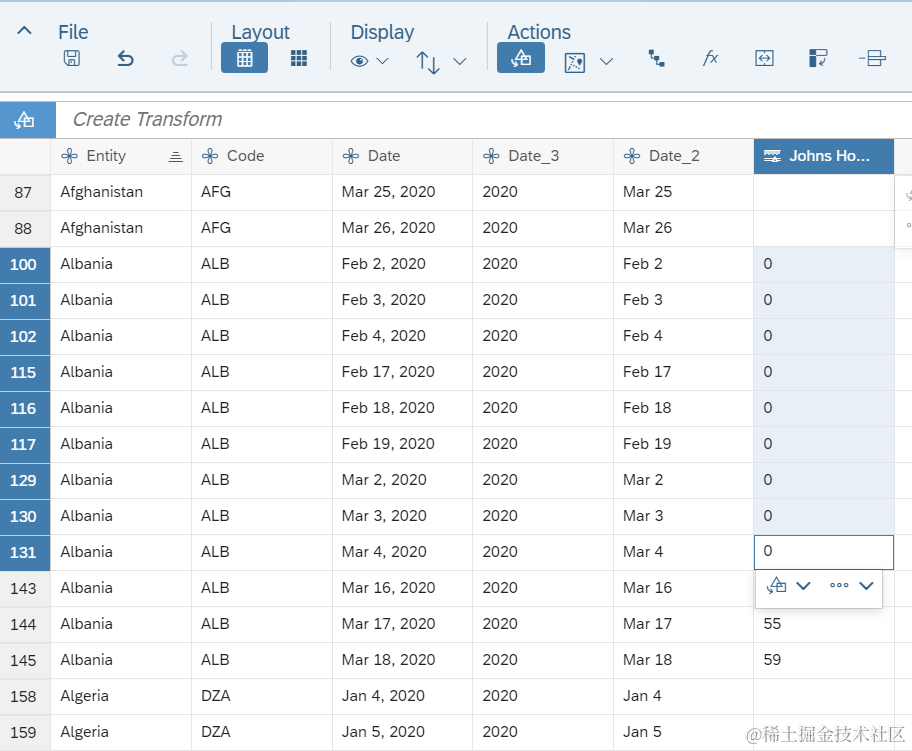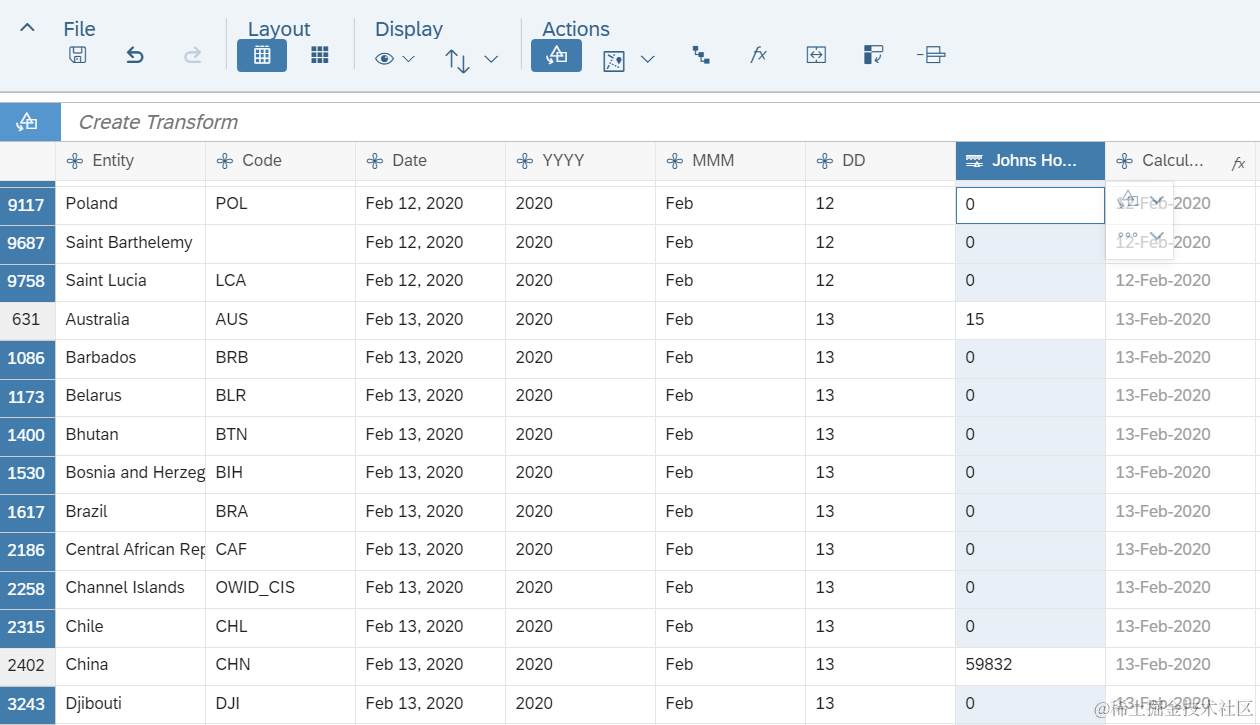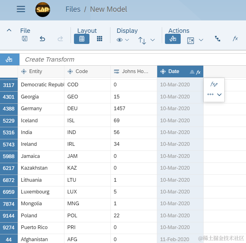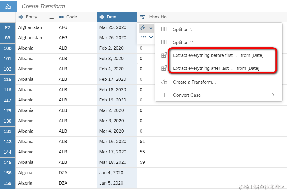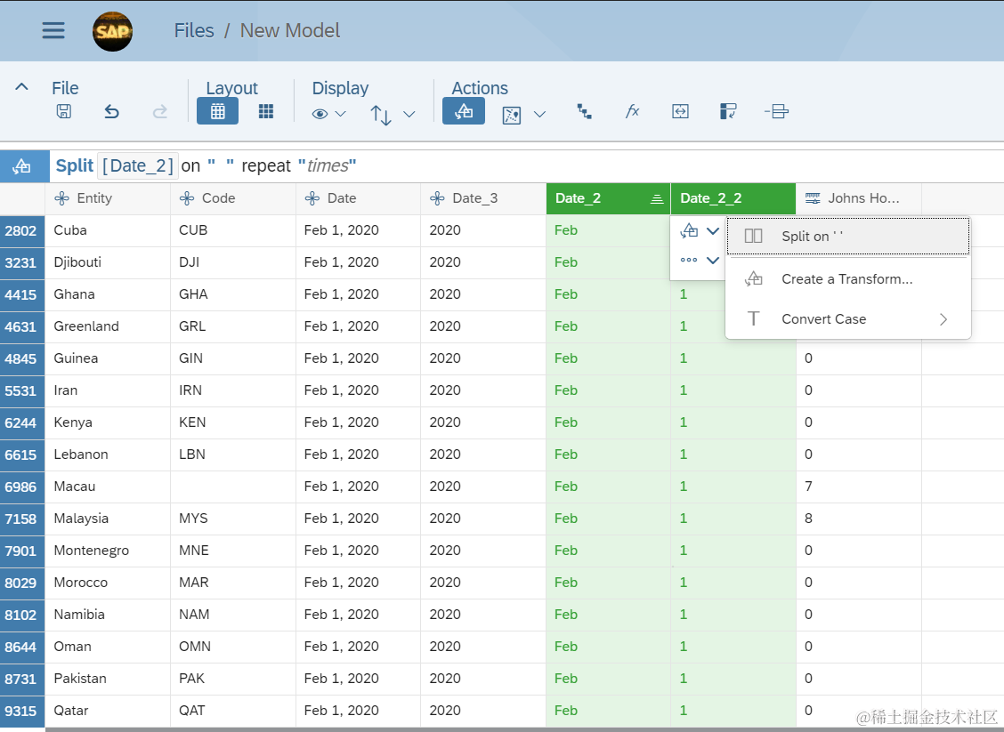而SAP Analytics Cloud Date类型的dimension,不支持这种日期格式,因此我们只得将其转换成SAP Analytics Cloud支持的格式之一。首先根据逗号进行分割,得到MMM DD和YYYY两列: