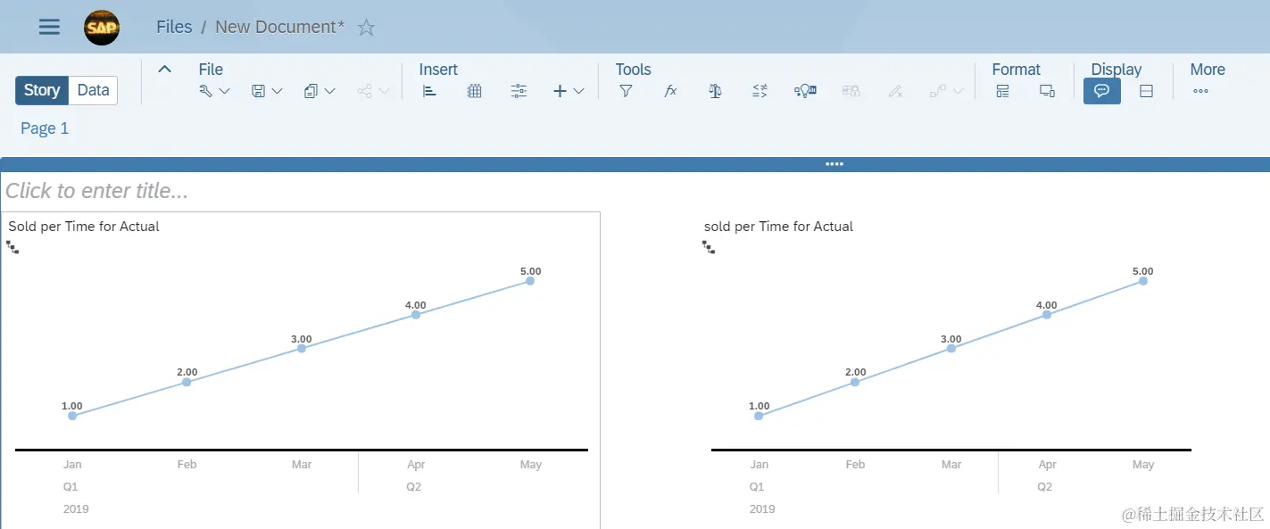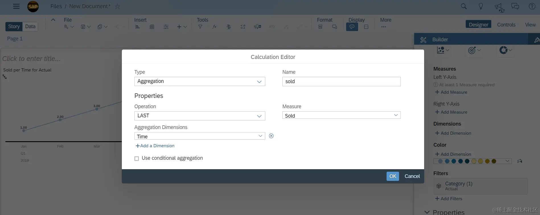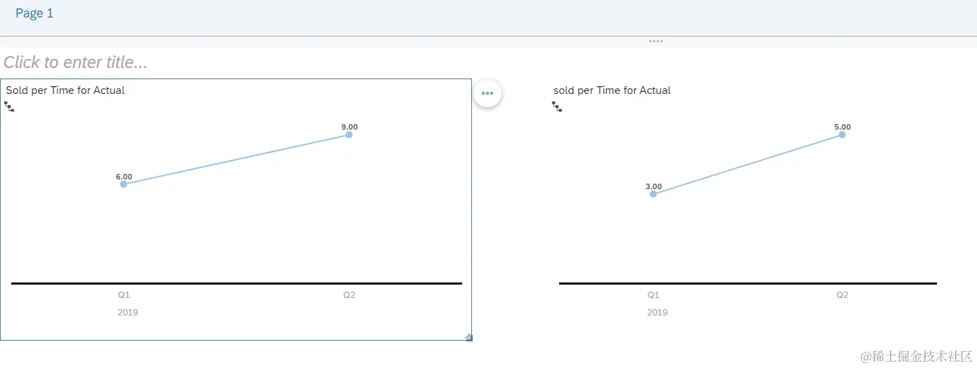 为了测试SAP Analytics Cloud的exception aggregation类型设置为LAST的效果,我创建了两个line chart,左边的没有使用任何额外的设置,因此sold这个measure采用默认的SUM进行聚合操作(aggregation),右边的使用了如下的设置: