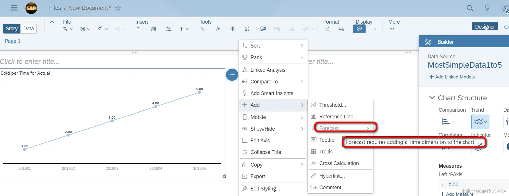 如果忘记了将excel的日期列在SAP Analytics Cloud里设置为Date类型的dimension,则在绘制出的Line Chart里,无法启用time series forecasting功能:
